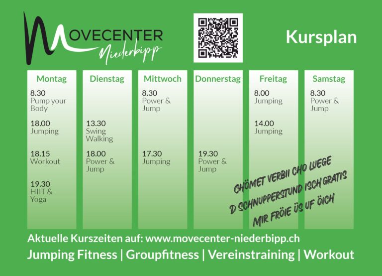 Willkommen im Movecenter – deinem ultimativen Ziel für Fitness, Spaß und Gesundheit! Bei uns geht es nicht nur darum, sich zu bewegen, sondern auch darum, mit Begeisterung und Energie in ein aktives Lebensgefühl einzutauchen. Unser Center bietet eine vielfältige Palette an Kursen an, die nicht nur effektiv sind, sondern auch jede Menge Spaß machen.